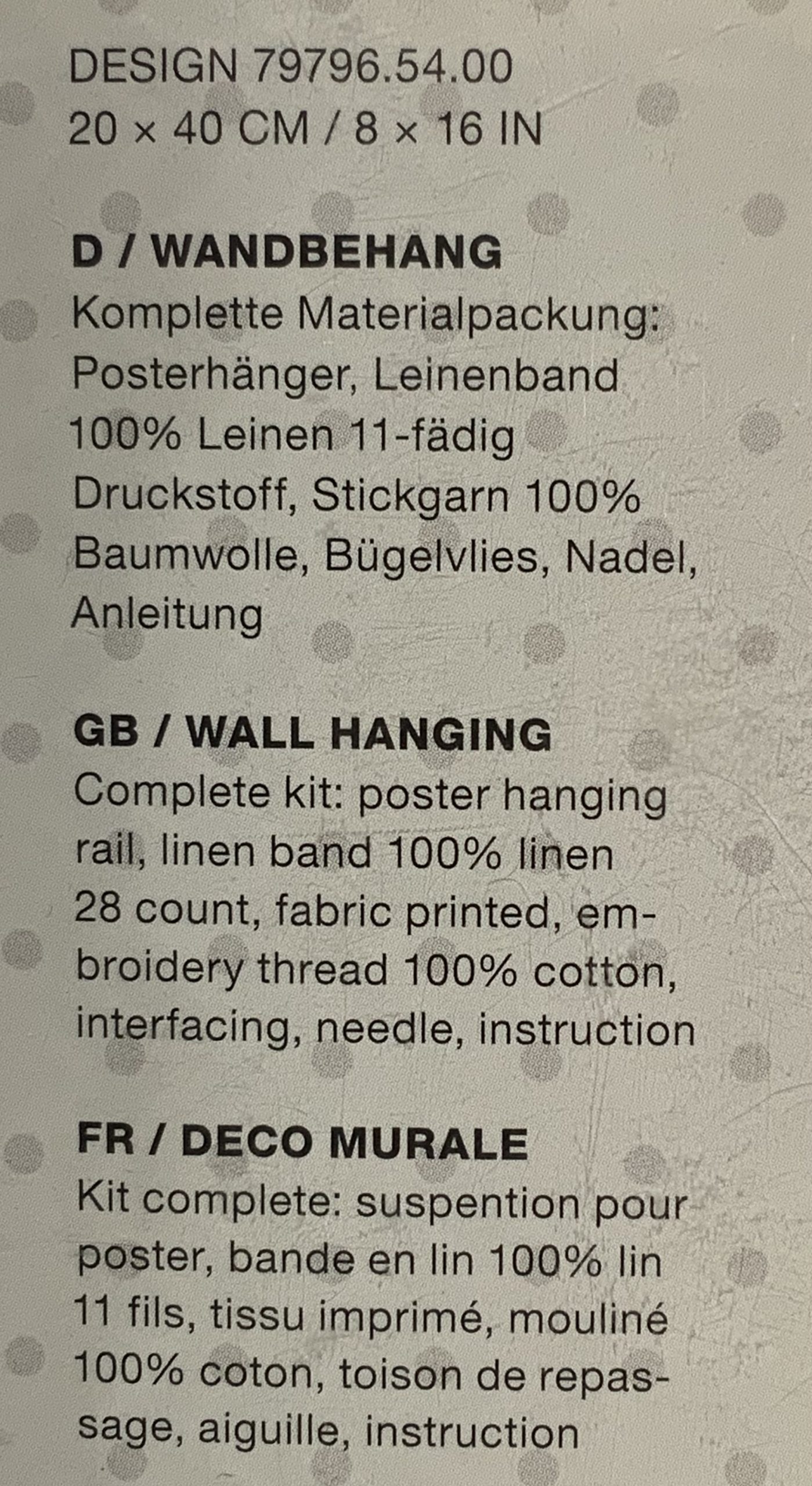 Materials : Pre-Printed Linen Band Fabric with Detailed Instructions, Stranded Cotton Threads, Needle, Interfacing & Hanging Rail.
